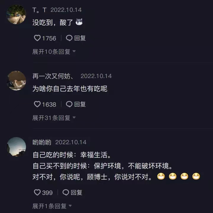 “自己吃的时候:幸福生活。自己买不到的时候:保护环境,你不能破坏环境。”