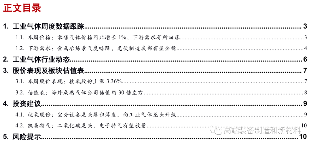 核心观点: 本周综合气体零售价格同比增长1%;氧气价格较弱,氩气逐步企稳 本周零售气体价格增速环比持平,我们测算综合气体价格为865元/吨,同比增长1%,环比下降3%。其中液态氧气单价为805元/吨,同比下降11%,环比下降7%;液态氮气单价为671元/吨,同比增长16%,环比下降2%;液态氩气单价为1372元/吨,同比增长3%,环比下降0.15%。 液氧、液氩价格走弱,预计短期零售气价仍面临压力 1)液氧及液氮:华北钢厂限产缓解,检修增多,短期需求呈弱势,市场供大于求。预计短期内市场需求延续疲软态势。上半年液氮市场表现可观,下游钢铁化工持续升温,较去年同期价格上涨。预计下半年液氮市场整体偏弱运行。 2)液氩:光伏产业链多品类价格开始下降,预计需求有望逐步企稳,本周液氩价格企稳回升。随着光伏装机拐点显现,看好下半年液氩价格回升。 行业动态:杭氧签约晋控新恒盛空分供气项目,出氧量6.2万Nm³/h 杭氧和晋控新恒盛于新沂签约空分供气项目。该项目共投资4.1亿元,采用BOO运行模式,可为“40.60”项目提供氧气62000Nm3/h、氮气130000 Nm3/h、仪表空气7000 Nm3/h以及工厂空气和液氮等产品。 持续看好工业气体行业国产替代,海外可比公司近万亿元人民币市值 1)电子特种气体市场自主品牌占有率仅10%,国产替代趋势明显、潜力巨大。 2)中国工业气体行业1500亿元市场,复合增速8%,有望诞生大市值公司。 3)海外可比公司林德、法液空、空气化工产品对应的市值折合人民币分别为近10000亿元、5200亿元和4200亿元,对应2021年的平均PE约为30倍。 4)国内空分气体市场集中度相对偏低,CR4约50%,而海外达70%。同时跨国公司国内份额约40-50%,近几年本土企业新签项目市场占有率大幅提升。 投资建议: 重点看好工业气体行业龙头杭氧股份、国内二氧化碳龙头凯美特气,重点关注华特气体、雅克科技、昊华科技、金宏气体等电子特气公司。 杭氧股份:看好工业气体业务市占率持续提升,做大气体、做精设备! 公开发行可转债申请获得证监会受理。近日发布“十四五”发展规划,长期目标:引领中国空分产业发展,成为世界一流的空分设备和气体运营专家。 1)气体业务增长幅度及持续性有望超市场预期。预计2021年全年新签气体规模有望达到50万方,同比增速超50%。我们预计公司2025年现场制气业务的产销量有望达300万方,收入达150亿元,收入复合增速达30%。 2)设备业务市场预期过于悲观,周期性有望大幅减弱。公司设备在手订单饱满,碳中和等政策会影响下游行业的投产节奏,但长期需求仍在。 凯美特气:全球第二大食品级二氧化碳生产商,电子特气成为新增长极 据海关及气体圈子相关数据显示,国内电子特气近千亿元人民币市场,进口替代空间广阔。电子特气行业壁垒极高,公司有望逐步取得重要客户认证,复制食品级二氧化碳的国产替代路径。 风险提示: 1)下游行业需求不及预期;2)零售气价大幅波动风险 |