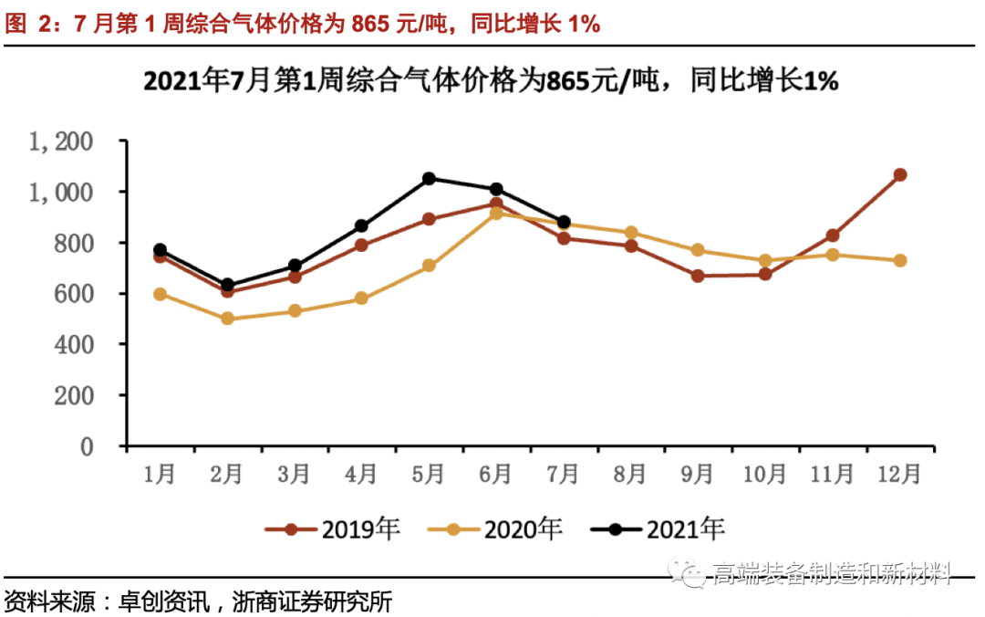 按照氧气、氮气、氩气4:4:2的比例进行加权,测算出的7月第1周综合液态气体价格为865元/吨,同比增长1%,环比下降3%。