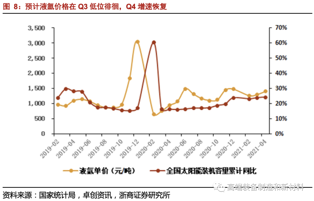 受光伏产业链上游的硅料价格上涨影响,太阳能装机需求承压。我们预计液氮价格Q3面临一定压力,Q4随着光伏产业景气度回升、去年同期基数相对不高,预计液氩价格增速会有所恢复。