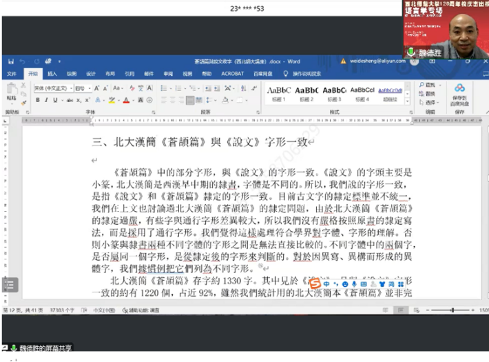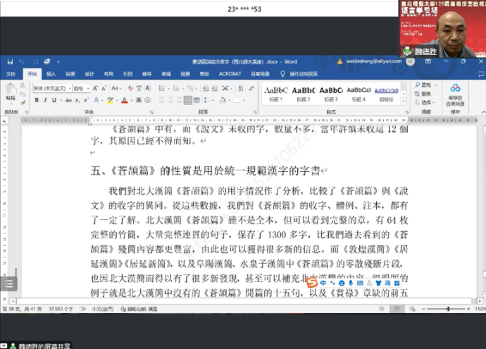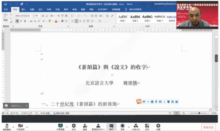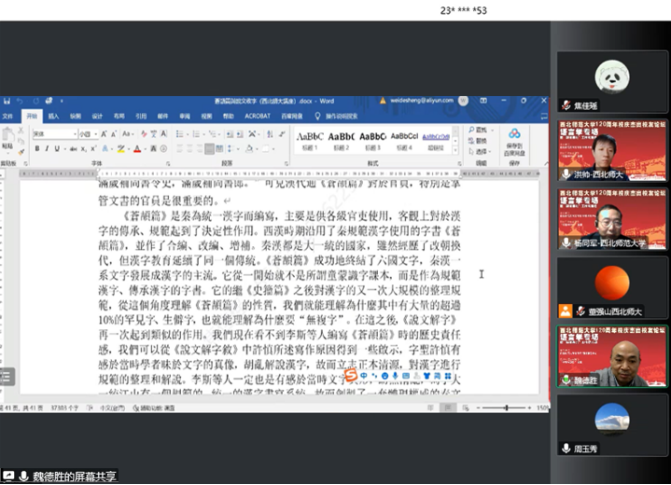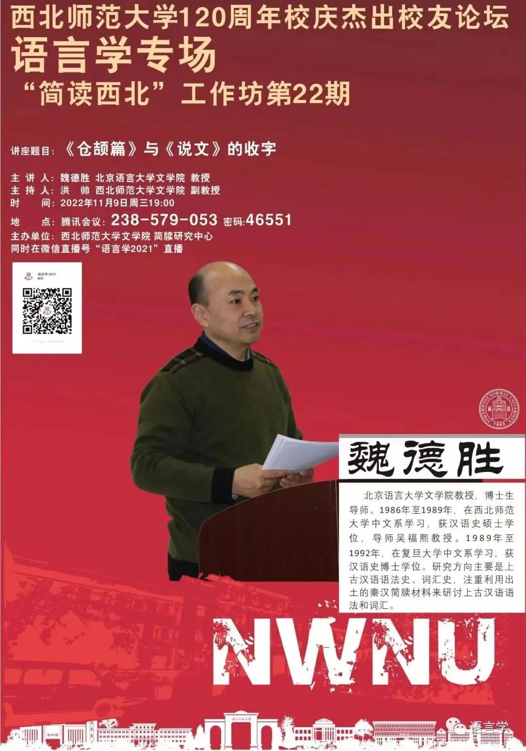 2022年11月9日,“西北师范大学120周年校庆杰出校友论坛·语言学专场”系列讲座第四讲顺利举办。本次讲座由西北师范大学1989届毕业生,现为北京语言大学魏德胜教授主讲,题目为《〈苍颉篇〉与〈说文〉的收字》。本次讲座由西北师范大学文学院洪帅副教授主持,西北师范大学文学院周玉秀教授、西北师范大学国际文化交流学院杨同军教授、甘肃省文物考古研究所张俊民研究员、兰州城市学院文史学院冯玉副教授及部分本科生、研究生共110余人参与了本次讲座。讲座在腾讯会议和微信公众号直播双平台进行,累计观看人数1300余人。本讲座也是“简读西北”工作坊第22期活动。