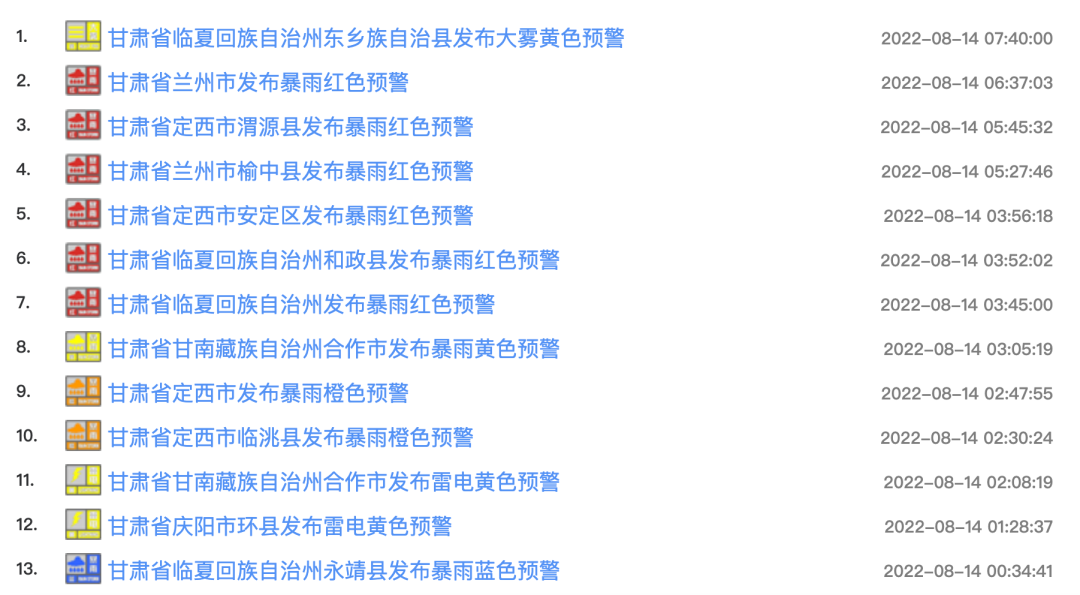 据了解,8月13日17时,甘肃省水利厅、甘肃省气象局联合发布山洪灾害气象风险黄色预警:预计未来24小时,兰州、白银、武威、临夏、甘南、定西等市(州)部分县区及兰州新区发生山洪灾害可能性较大(黄色预警)。