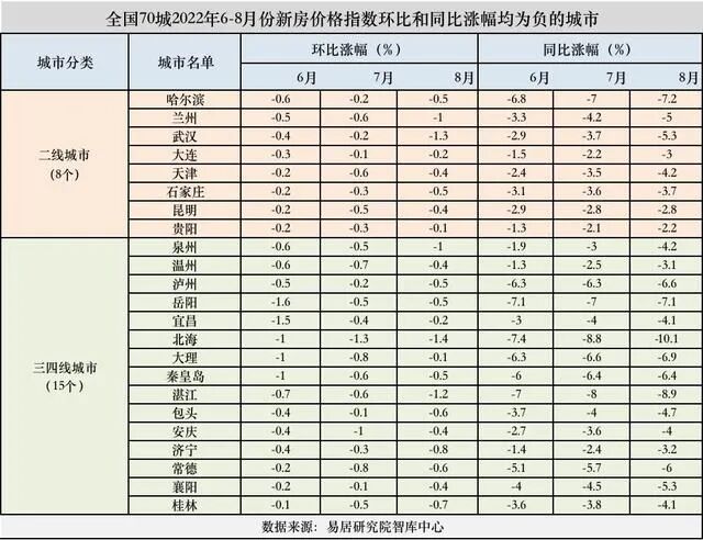 值得注意的是,上述文件框定了个人住房贷款利率可以突破4.1%的下限要求的城市和时间范围:对于2022年6-8月份新建商品住宅销售价格环比、同比均连续下降的城市,在2022年底前,阶段性放宽首套住房商业性个人住房贷款利率下限;且限定在2022年底前,即今年四季度的3个月时间。据21世纪经济报道,易居研究院智库中心提供的数据显示,国家统计局70个大中城市房价指数数据中,至少有23个城市符合新政要求。其中二线城市有8个,分别为哈尔滨、兰州、武汉、大连、天津、石家庄、昆明和贵阳;三线城市有15个,分别为泉州、温州、泸州、岳阳、宜昌、北海、大理、秦皇岛、湛江、包头、安庆、济宁、常德、襄阳和桂林。