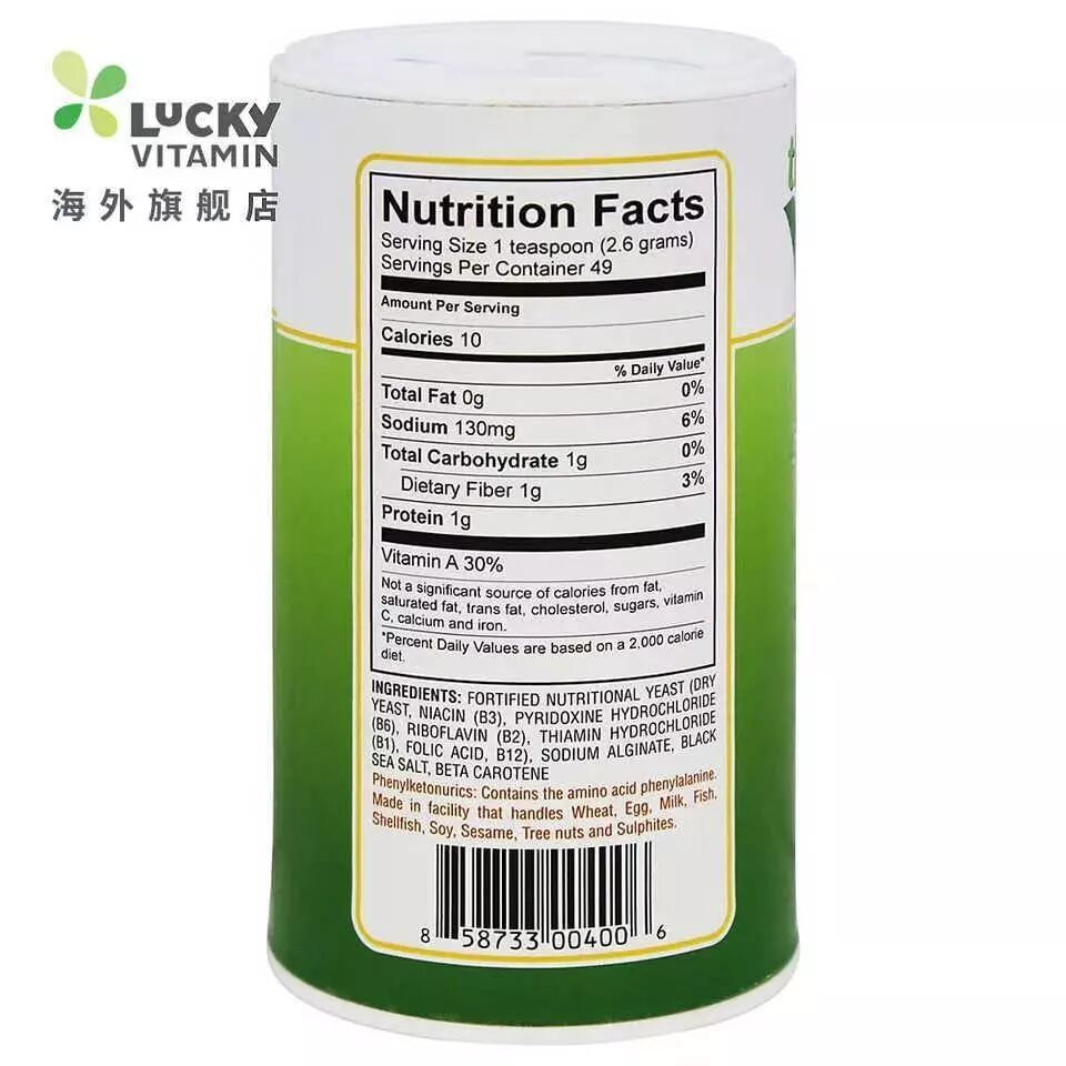 Fortified nutritional yeast (dry yeast, niacin, pyridoxine hydrochloride, riboflavin, thiamine hydrochloride, folic acid, B12), sodium alginate, black salt, beta carotene.