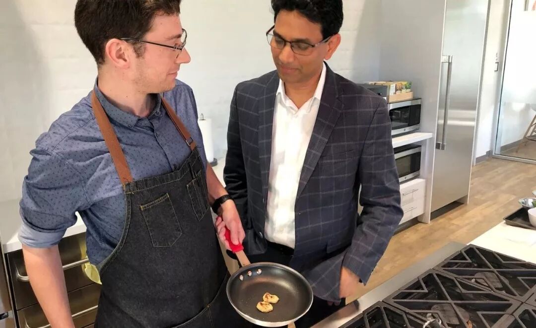 Memphis Meats首席执行官乌玛•瓦莱蒂(Uma Valeti,右)与公司配方科学家摩根•瑞斯(Morgan Rease)站在一起,他们正在煮一份基于细胞的鸡肉样品。Memphis Meats CEO Uma Valeti (right) stands with Morgan Rease, the company's formulations scientist, while they cook up a sample of cell-based chicken.