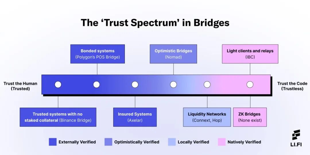 可以得知,跨链迁移的可靠性完全取决于以上几个环节是如何协作的。它们需要一个验证人来保证各个环节没有问题,这个验证人的选择是桥工作方式的主要区别:有的桥使用受信任的系统,有的桥则使用去信任化的系统。