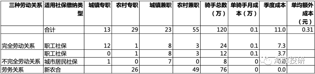 基于以上信息,海豚君对不用类型骑手选择职工社保的比例做了合理假设,对应目前120万骑手中大约30%人会缴纳职工社保: