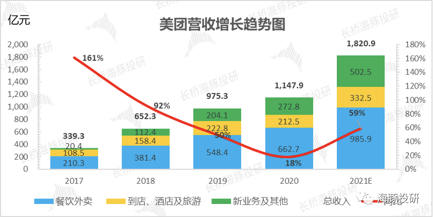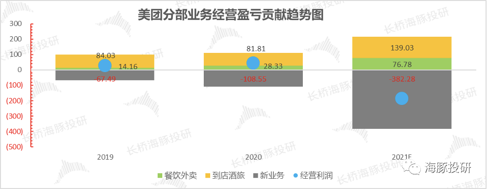 另外,这部分成熟的第一曲线业务中,还有一个美团顺着场景自然延伸出的酒旅业务,经典的高频打低频的业务逻辑,海豚君在《杀疯了的阿里、美团和拼多多,电商流量战后真有壁垒吗?》已有解释,具体不再赘述。