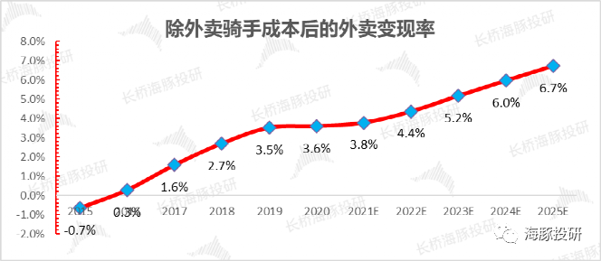 这部分商户端所付的骑手费目前稍超交易额的2%,针对用户端收的骑手配送费目前平均大约2元/单;未来上升的动力主要来自于夜宵、长距离订单等结构性变化来提升,但空间也不大。