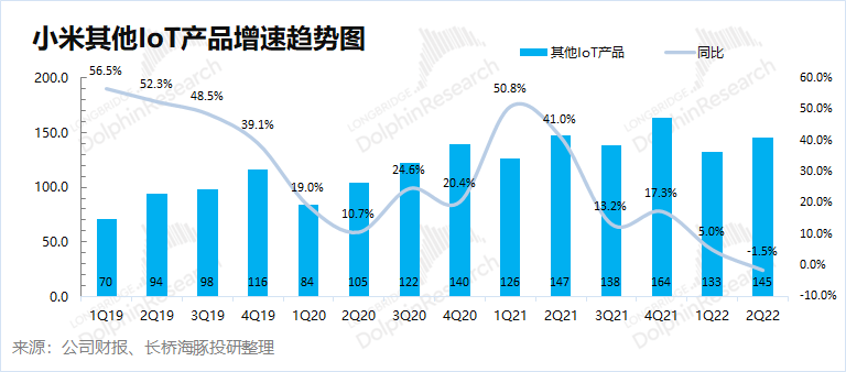 2022 年第二季度小米 IoT 业务实现营收198亿元,同比下跌4.4%,主要受全球宏观经济影响,境外市场若干IoT产品需求减弱。