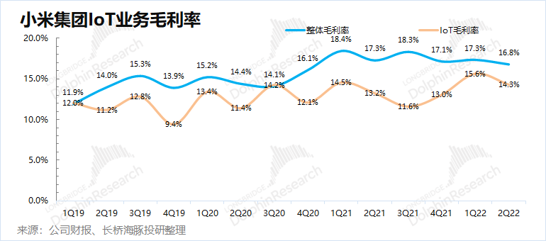 第二季度 IoT 业务的毛利率14.3%,同比上升1.1pct。IoT 毛利率从11.6%的低点开始,连续三季的同比上升,印证了海豚君在3月财报点评《中规中矩的小米:食之无味,弃之可惜》中的观点,“面板价格的下跌,从成本端推动业务毛利率的回升”。