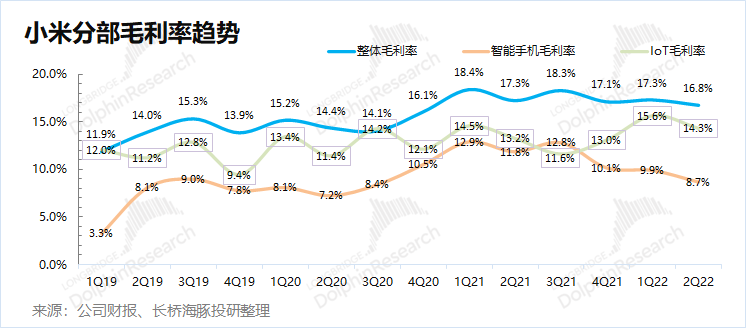 2022 年二季度小米整体毛利率16.8%,同比下滑 0.5pct,公司毛利率下滑主要来自于手机业务和互联网服务两项业务毛利率的同比下滑。