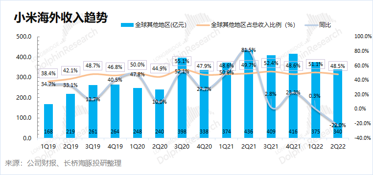 小米本季度海外互联网收入仍实现了52.1%的增长,而公司本季度海外收入的大幅下滑,主要来自于硬件业务。在地区冲突、疫情因素、海外物流以及各国政策等不稳定因素的影响下,直接影响了小米的手机和IoT产品的出口。根据海豚君的测算,小米手机二季度在海外市场(除中国以外)出货量同比下滑27%。