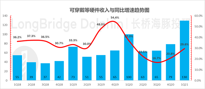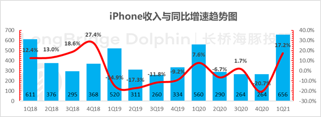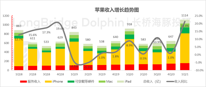 疫情依然阴魂不散,华为事件短期难有转机,而苹果软性的品牌力则会持续存在,加上当前苹果手机的超级换机周期刺激,苹果已进入明确上升周期。本文为海豚投研原创文章,未经授权,不得转载;建议感兴趣的用户添加微信号 “longbridge002” 加入海豚投研圈,一起切磋全球资产投资观点!北京时间 1 月 28 日凌晨的美股盘后,苹果公司发布的 2021 财年一季度财报(截至 2020 年 12 月)。在 9 月至 11 月通过三场新品发布会的狂轰乱炸之后,苹果各项业务已强势回归:(1)手机、电脑、iPad 均实现了双位数的增速,尤其是 iPhone 上季度收缩 20% 以上后,本季度增速高达 17%,印证了苹果手机进入超级换机周期的说法。同时,居家办公的背景下,Mac 与 iPad 的增长均在 20% 以上,iPad 更是超过了 40%;(2)苹果手机标配套餐持续偷工减料,削去充电线与有线耳机之后,不仅节省了成本,更是拉升了可穿戴等小硬件的增长,本季度增速已回升至 30%。(3)服务业务也在加速增长,双生花逻辑持续验证:互联网业务需要依赖硬件出货为基础,随着硬件业务的强势回归,互联网业务增速也进入加速状态。苹果互联网服务达到了 158 亿,同比增速加速至 24%;毛利率在规模效应下创新高,超过了 68%,继续逐季稳步提升。(4)苹果本季度总收入 1114 亿美元,同比增长达到了 21.4%,远远强于市场预期 1021 亿美金。(5)成本上,软件业务毛利率继续逐季改善,硬件业务由于新品成功,加上相对高毛利的 iPhone 销售回归,硬件毛利率也出现难得上升势头。(6)费用上经营杠杆效果明显,超额收入的实现并未伴随超额的费用投放,最终 335 亿美金的利润大幅超出了市场预期 283 亿。![]()