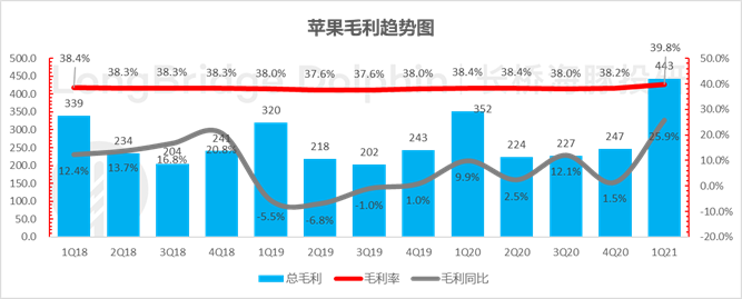同时,自疫情以来,苹果就以疫情为由不再提供指业绩指引,本季度指引再次缺失,也就是说苹果已连续四季度不提供业绩指引。但经过几个季度的验证,可以明确看到,疫情对很多硬件公司是灾难,但对强产品力与品牌号召力的苹果却是实打实的雪中送炭。居家办公 + 华为全球退出 + 互联网业务定心剂的组合药方已经苹果充分享受到了盈利增速恢复与估值倍数拉升的 “戴维斯双击”。本季度苹果毛利达到了 443 亿美元,同比增长微增 26%,稍超收入增速;毛利率 39.8%,显著超出了市场预期 38.1%,核心是硬件毛利改善超预期。