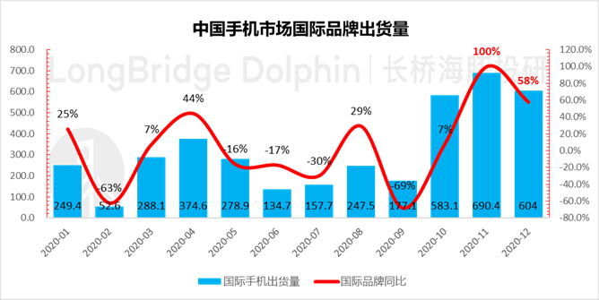 在中国区,由于中国 5G 推广走在世界前列,此前缺 5G 手机的苹果在大中华区之前三个季度表现非常糟糕,但本季度明显强势崛起。这也与之前中国信通院的数据一致:以苹果为绝对主力的国际品牌在 iPhone 12 推出后,11 月、12 月在中国的出货量明显暴涨。