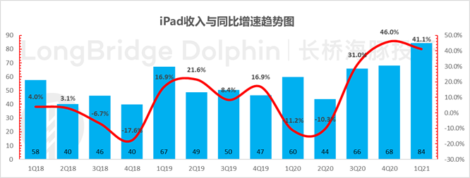 同时作为疫情之下居家办公的受益股,苹果生产力设备 iPad 与 Mac 销量在新品狂推的推动下增速持续坚挺。譬如,去年上半年就进入高速增长状态的 iPad 本季度收入继续高速度增长,同比高达 41%。