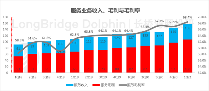 同时,服务业务毛利率再上台阶,已达到了 68.4%,持续逐季提升。