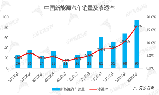 在国内传统汽车零售被消费潜力弱、芯片短缺的不利因素笼罩的情况下,新能源汽车月销量持续创新高,渗透率快速拉升至15%以上,预示着一个早期的行业跨入快速成长阶段,动力电池的需求确定性极高。