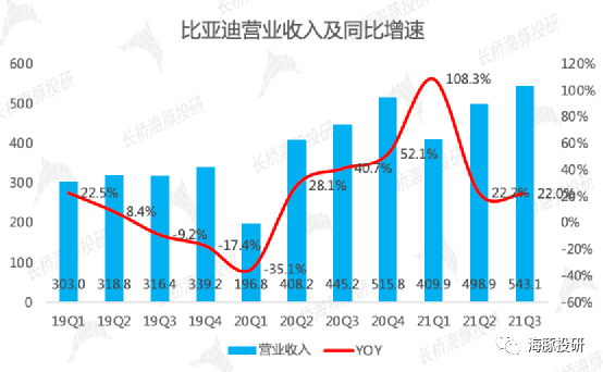 带着以上问题,我们来详细分析比亚迪的2021年三季报:【1】汽车销量:DM-i平台大获成功,比亚迪汽车销量一路狂奔:外在驱动(新能源汽车渗透率快速提升)和内在驱动(刀片电池在全系新能源车上搭载、混动平台DM4.0车型上市)的共振下,2021年第三季度,公司新能源汽车销量爆发式增长,销量超18万辆,同比增289%,季度销量及同比增速持续创新高,并带动公司整体销量突破20万辆,同比增87%,年销量100万辆的台阶就在眼前。同时从销量结构上来看,公司业务更加纯粹,作为新能源汽车领军品牌,新能源乘用车销量在公司整体销量中占比高达88%,这样的数据表现才符合公司的口号和定位。(在此前的深度文章中,长桥海豚君曾抽丝剥茧的寻找比亚迪的核心,其中提到比亚迪的营收结构和毛利结构,汽车业务和手机业务核心贡献超90%的营收和毛利,因此在公司不直接披露汽车业务营收和毛利的情况下,长桥海豚君将扣除手机业务(以港股上市的比亚迪电子为运营主体)后的数据近似作为汽车业务的数据,不纠结具体的绝对值,主要观察趋势。)【2】营收:相比销量增速,营收增速相形见绌:扣除比亚迪电子之后,公司第三季度实现营收332亿元,同比增36%,在汽车销量同比增85%的前提下,营收增速黯然失色,意味着ASP下行。从ASP的角度思考,长桥海豚君认为,DM-i插混车型占比的提升可能导致公司单车均价下行,例如定价更低的DM-i版本的秦和宋迅速成为爆款车型。【3】盈利性:毛利率下滑,推测系ASP下行和锂电池上游原材料涨价。2021年第三季度,扣除比亚迪电子后的业务毛利率为17.2%,环比二季度下滑1.5pct,同比下滑近10pct,单车均价的下行对毛利率是直接利空,但除此之外,比亚迪造车的零部件自给率比较高,尤其是电池自供,在锂电上游原材料涨价压力下,下游整车销售难以提价的情况下,毛利率被挤压是正常的。近日传出比亚迪电池提价不低于20%的消息中称,“2021年锂电池原材料不断上涨,正极材料LiCoO2价格涨幅超200%,电解液价格涨幅超150%,负极材料等供应紧张,综合成本大幅大幅提升”。不过相比刚刚发布三季报的宁德时代的毛利率,比亚迪的盈利抗性相对弱一些。【4】利润明显好转。从下图可以看到,比亚迪汽车业务的盈利情况非常不稳定,比亚迪电子才是公司利润的基石,但本季度比亚迪电子表现很差,反而汽车业务有了明显的边际好转。海豚君按照持股比例把比亚迪电子的归母净利润从公司的归母净利润中扣除,扣除后的归母净利润为9.3亿元,环比二季度增141%,同比增77%,在极大的成本压力下,实属不易。净利率2.8%,虽然绝对值仍不高,但处于近三年的高位,且处于边际好转中,好转并非来自毛利率的好转,而主要来自现金流宽松后,财务费用的节省。如果比亚迪销量的增长不仅带来收入的提升,还能通过杠杆释放更大的利润,则比亚迪业绩的爆发力非常值得期待。此外,我们知道比亚迪利润的一大支撑来源是政府补助,确认在“其他收益”这一会计科目中。本季度其他收益5.43亿,仍然对公司利润贡献较大,但即使剔除政府补助的影响,三季度公司汽车业务的利润表现也是不错的。手机部件及组装不是公司估值的核心业务,却是公司业绩的核心,因此长桥海豚君在此做简要分析。多因素扰动下,比亚迪电子营收增速下行。2021年第三季度,以比亚迪电子为运营主体的手机部件及组装业务实现营收211亿元,同比微增5%,业绩增速呈明显下滑趋势。前三季度合计实现营收659亿元,而wind2021年一致预期的营收为990亿元,第四季度基本不可能完成全年预期。影响业绩的主要因素为:芯片短缺导致客户需求减弱、国家能耗双控政策短期内制约公司生产、去年新增客户带来高基数、疫情防护常态化导致医疗防护产品需求同比大幅下降。盈利能力回到正常比较差的水平。2021年第三季度比亚迪电子毛利率7.3%,环比小幅回升主要因季节性因素,同比大幅下滑主要系去年异常地好。净利率2.4%,重新回到盈亏平衡略上方的水平。在成长性和盈利性均表现不佳的情况下,2021年第三季度,比亚迪电子实现归母净利润5.1亿元,同比大幅下滑72%;前三季度合计实现归母净利润21.6亿元,距离wind2021年一致预期的41亿元有不小差距,明显低于预期。【1】营收及归母净利润:2021年第三季度公司实现营收543亿元,同比增22%,环比二季度增9%;2021年前三季度公司实现营收1452亿元,同比增38%;营收增长主要来自汽车业务,汽车业务的增长驱动则来自销量的突飞猛进。2021年第三季度公司实现营收归母净利润12.7亿元,同比降27%。前三季度实现归母净利润24.4亿元,同比降28%。综合上面的业务拆分,拖累公司整体利润的业务是手机部件及组装,而我们核心关注的汽车业务利润表现反而是不错的。- 其他收益基本是政府补助,公司12.7亿的归母净利润中有5.4亿元的政府补助,政府补助仍然对比亚迪的盈利有重大影响,但剔除政府补助后,公司仍然有正的利润;