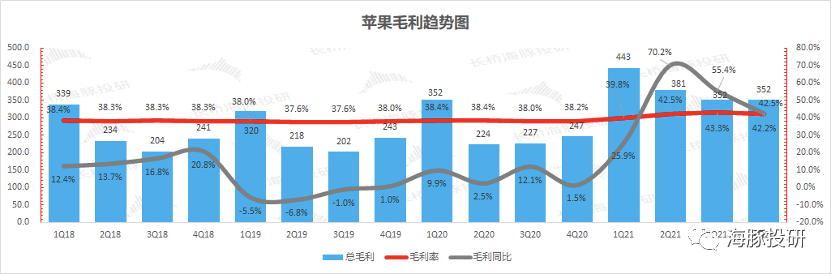 硬件和服务增长:将苹果业务拆分为硬件和服务两部分看,本季硬件和软件业务同比增速都有所下滑,但两者增速仍分别保持在29.8%和25.6%的历史相对高位。