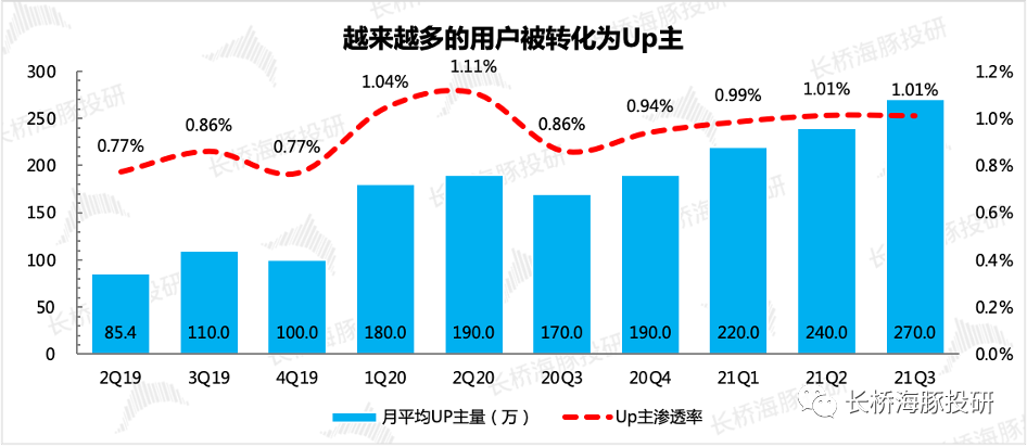 Up主端不仅规模扩张,并且更多的是用户内部自主转化而来,体现了一个“外部引流+内部转化”的存在内生增长动力的健康生态。