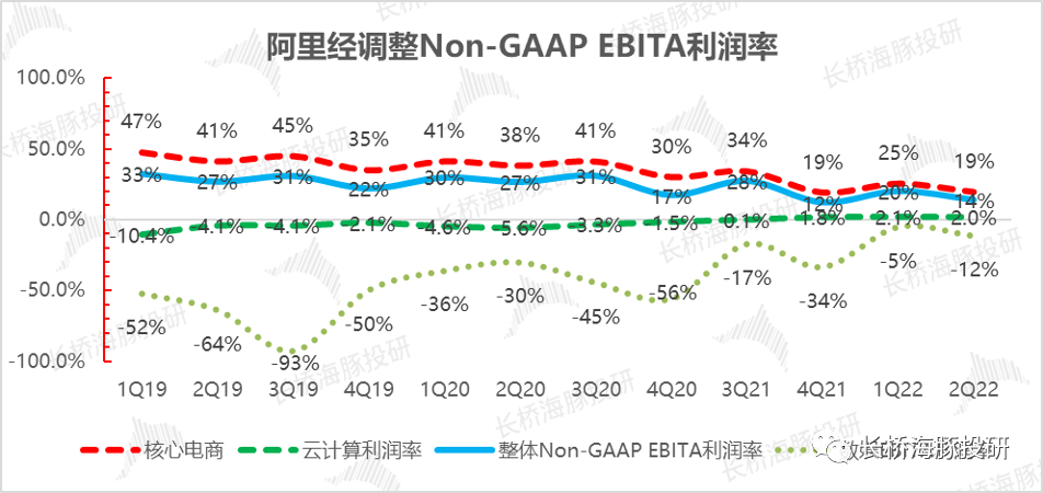 阿里这个季度的Non-GAAP EBITA利润280亿,利润率14%,基本是在海豚君看到的市场预期的下限位置和海豚君的悲观预期,是毫无争议的差。