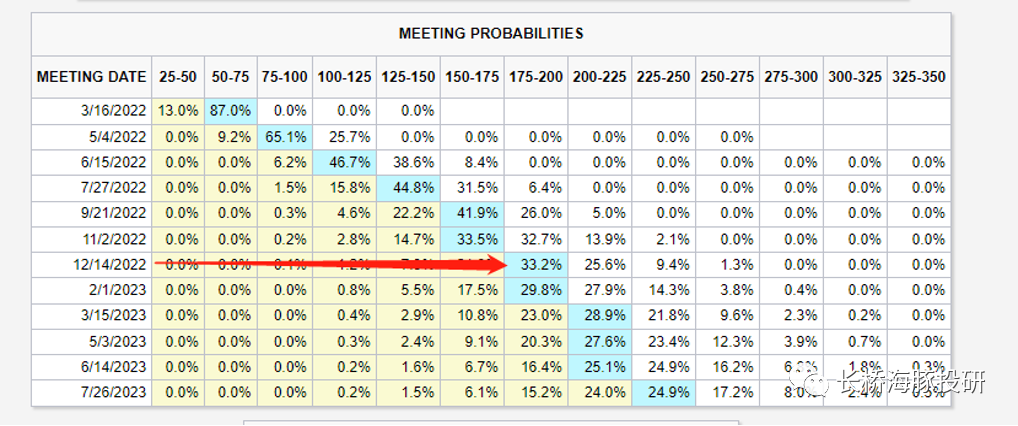 而对BETA风险的判断主要在于通胀脱缰的程度后续是否会导致加息和收水步伐不断挑战市场预期。市场目前预期,到2022年末美联储有5成以上的概率加息至少7次约175个基点。