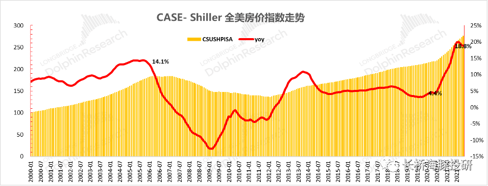 与房子相关的物价(房租+自住房等效房租)在CPI中的权重接近31%,而房租合同大多按年签,房租上涨一般滞后房价上涨一年以上,而美国房价去年一整年都在猛涨当中,最近虽有小幅回落,但同比涨幅依然有18%左右,所以最近几个月CPI惯性上冲基本没有悬念。