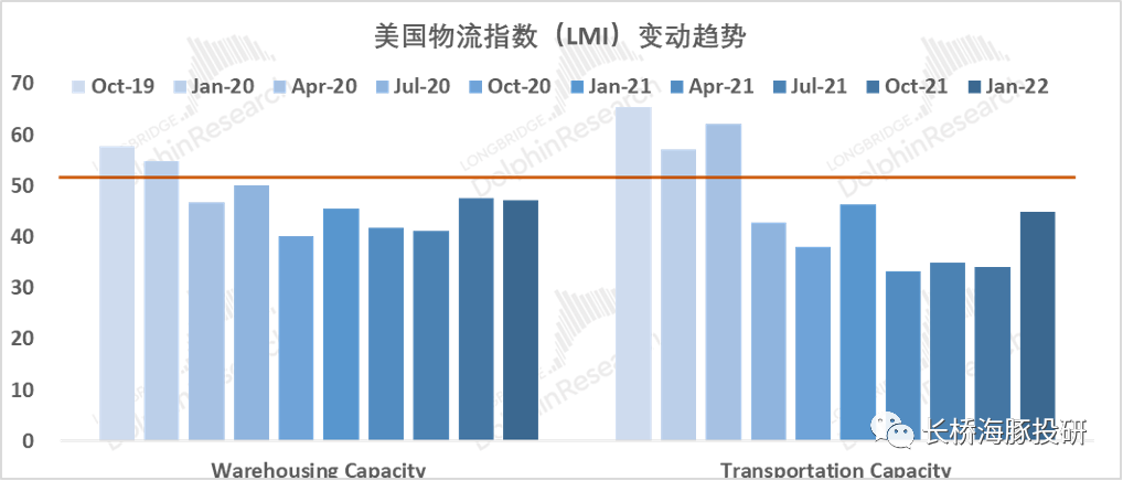 但从美国的物流指数来看,美国尚富余可用的仓储和运输能力(Warehousing/Transportation Capacity)在逐步改善,说明仓储和运力的紧张程度在逐步缓解当中。