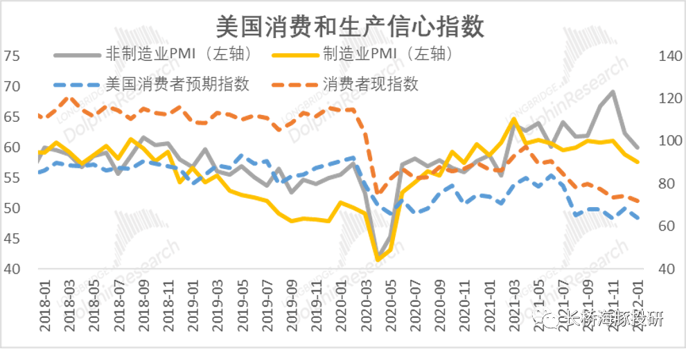 事实上,海豚君的这一担忧在一个前瞻指标中也能寻找到一些迹象:美国的消费者信心指数自21下半以来便持续走低,而提现生产者的PMI指数仅2个月以来也边际回落(但仍高于50的枯荣线)。