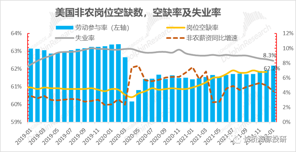 而由下图可见,22年1月美国的劳动参与率显著提升。而在劳动力供给增加的背景下,非农岗位薪资的同比增速也由11月的5.3%回落到1月的4.2%(值得注意薪资4-5%的增长低于整体CPI增长)。“价量”双重验证下,我们认为美国就业加速恢复的拐点已经到来。