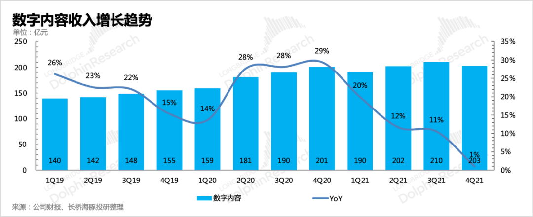 数字内容是泛娱乐重要一环,腾讯投入不少,但一直未能对腾讯业绩发挥支撑作用。四季度收入203亿,同比增长1%,结合爱奇艺、腾讯音乐、阅文的财报,数字内容的增长放缓也算是预期之内。整体行业仍然在痛苦的供给侧改革中,但平台对注重投资回报效率的觉醒,将会支撑他们挺过寒冬。