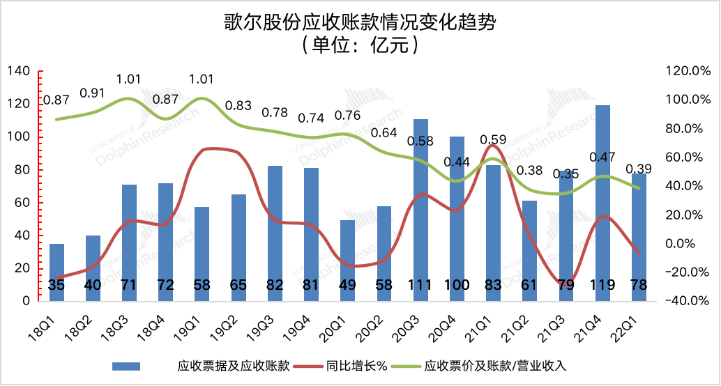 歌尔股份2022年第一季度应收帐款78亿元,同比下跌6.3%。从应收帐款/营业收入指标看,歌尔股份本季度有所回落至0.39,整体仍维持在较低水位。