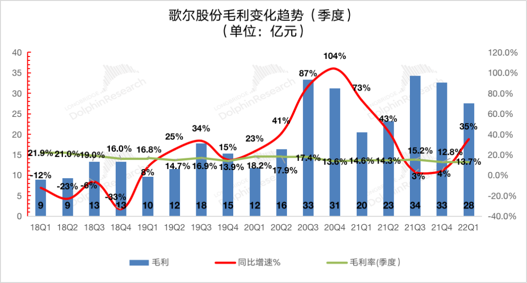 歌尔股份2022年第一季度实现毛利28亿元,同比增长35%。公司本季度毛利率仅为 13.7%,仍处于较低水位,同比下降 0.9pct,低于市场预期(14.2%)。