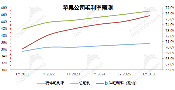 苹果的毛利率水平,也是由硬件和软件两部分共同形成。由于苹果公司硬件端的收入占据八成左右,所以公司综合毛利率的表现更接近于硬件端的毛利率水平。