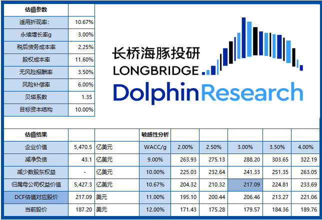 除了上述销量和盈利指标的的预测调整,长桥海豚君认为,基于当前利率走势,10年期美债到期收益率从年初的1.5%上涨已经上升至3%左右。若将此前用的2%的无风险收益率(对应wacc为9.32%)上调到3.5%(对应wacc为10.67%),则对应公司DCF估值为5427亿美金总市值,每股217美元,存在16%的上升空间。