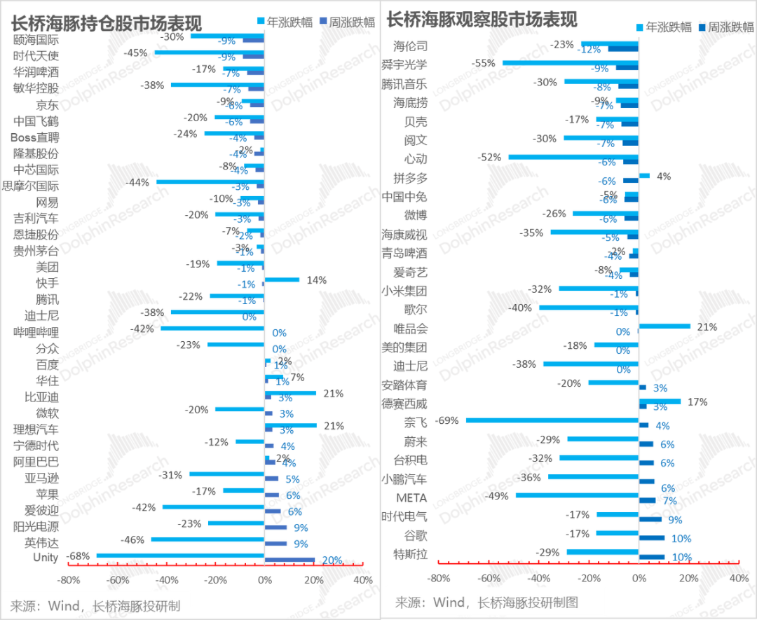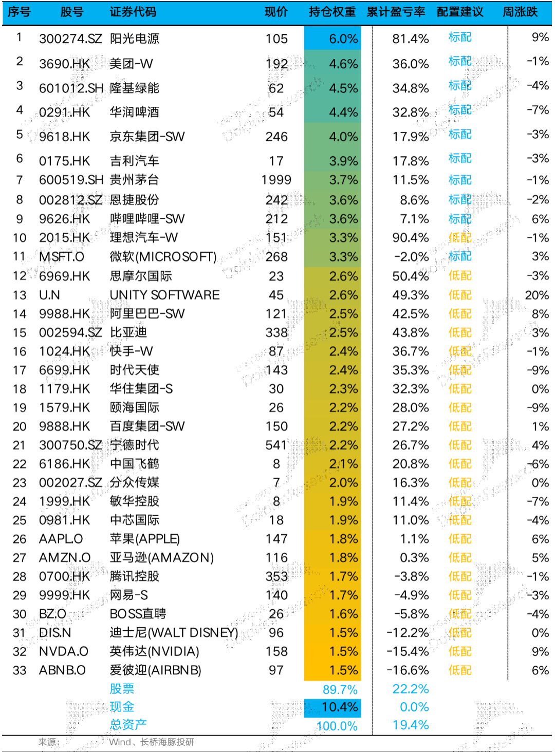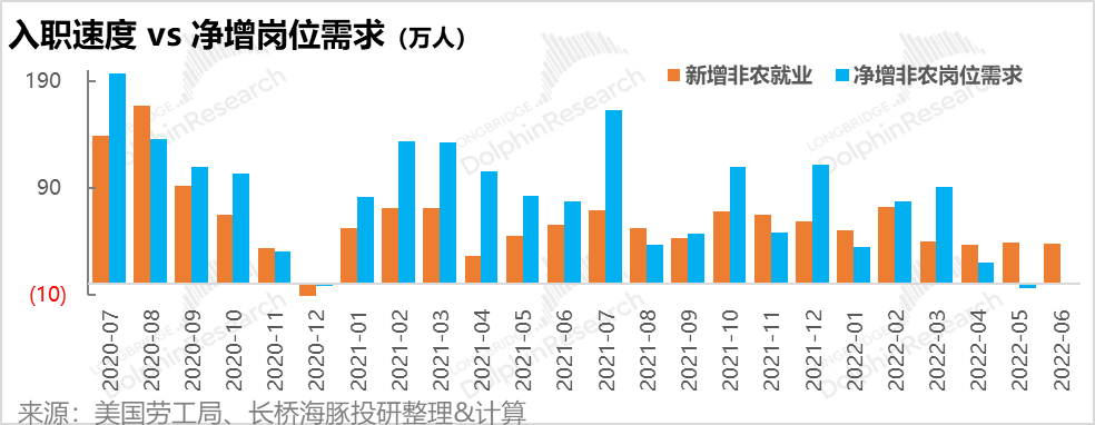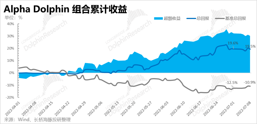 与依旧疲软的房贷数据相呼应,在经历了6月下旬的迅猛反弹后,国内楼市在上周再度转冷。全国30城新房成交面积同比-43%,增速再度由正转负;二手房市场表现相对更优,全国18城二手房成交面积148万平,同比-7.1%。由于成交数据再度转弱,市场又开始担心6月下旬的反弹是否仅仅是疫情后积压需求的一次性反弹。而近期各地新房停工,业主停贷,部分房企无力还债,部分港股上市头部房企被剔除出恒生指数的舆论在发酵后,也使得市场对房地产市场的预期再度转变,因此今日地产产业相关股票皆大幅下跌。展望下半年,海豚君认为经济下行压力、楼市成交继续断崖式下跌,以及在此背景下政府对房地产的刺激力度是否会继续加大的博弈将主导楼市和地产链相关企业的表现。上周美股在普遍预期衰退,已经开始交易衰退情况下的“降息+宽松”的市场戏码了。结果是在标普500指数当中,涨幅最高的是今年以来跌幅最大的通讯设备与非必须消费,同时与资源品相关的板块比如能源、材料、公共事业等跌幅较大,是典型的CPI控制后进入衰退的预期,在这种情景下,美联储进入降息周期,然后估值修复,只是这个情景市场至少提前了半年来交易。就美国非农就业数据来看,六月非农就业37万人,失业率3.6%,是持续高就业和低失业的良好状态,似乎美联储想要的打击企业就业需求并没有出现。但事实上,从海豚君更加关注的两个指标,用工紧张程度(待就业人口/非农岗位空缺)从5月开始已经有所缓解。从新增就业和净增岗位需求的角度来看,五月的新增岗位需求已经转为负值,相当于就业市场上,今年五月,出现了自2020年5月(2020年美国疫情之后)以来,首月净增岗位(新增岗位发布减去岗位离职)为负值的状态,企业招人实际已开始收缩。也就是说,目前劳动力市场上的新增就业更多是历史累积岗位的消纳,劳动力市场已有冷却迹象,而6月的非农岗位空缺数还要等到8月才能知晓,海豚君会密切跟踪。同时企业员工们的平均薪水同比增幅4.2%,并未跑超CPI的增速,实际薪资增幅还在负值当中,看起来工资通胀的螺旋还未形成,交易衰退确实有一定的宏观基本面基础。另外从市场整体的资金走势上,北上资金的买入幅度在放缓,而南下资金经过三个季度的净流入之后,也出现资金净流出的情况,行情似乎有反转迹象,市场对疫情反扑明显非常敏感。上周(7/4-7/8)组合收益单周下跌0.1%,单股权收益周跌幅约0.12%,在国内指数普遍下跌的情况下,算是基本跑平了。相比之下,上周标普500指数上涨1.9%,明显跑输,主要是中概资产回调拖累;不过Alpha Dolphin还是跑超了上周的沪深300(-0.8%)和恒生科技-1.3%的表现,主要是组合中的纯美股和上周光伏表现较好,把组合拉回了一点点。自组合开始测试到上周末,组合总回报是19.5%,与标普500相比的相对回报为30%。海豚的Alpha Dolphin组合上周的表现基本在前述大的交易逻辑的体现;比如消费上,之前一周如何演绎的疫情放开(比如上海放开堂食),上周差不多原封跌回去。反而美股在“倔强”的衰退预期交易当中,越是市值相对小的票,回弹力度越大。上周的交易中,海豚君注意到近期北上资金持续买入分众,另外吉利、快手、思摩尔国际的两地通资金的净买入幅度也在加大。而卖出幅度较大的依然是中芯国际和敏华控股,同时宁德时代和美团也再被两地资金净卖出。如果以3月1日内部测试启动时点来看,海豚Alpha Dolphin组合截至上周五的整体收益是19.5%。上周海豚君对组合无调仓,组合共配置了33只股票,其中标配10只,但低配个股为23只。截至上周末,Alpha Dolphin资产配置分配和权益资产持仓权重如下:![]()