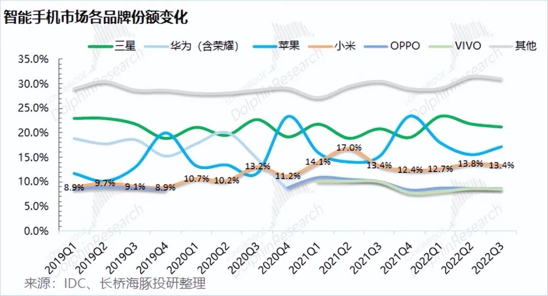 ②小米市占率:依然稳固。由于iPhone14系列新机的提前发布,苹果在今年三季度抢占了更多的市场份额。反观OV在三季度市占率同比都有较明显的下滑,小米竟依然维持13.4%的市占率。