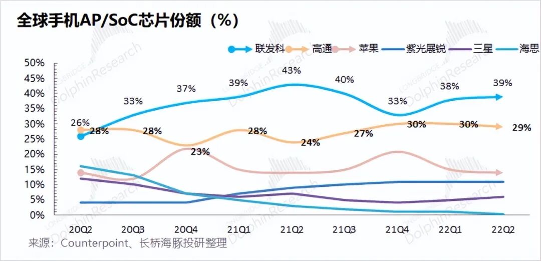 1)AP/SoC量的维度:高通份额继续提升。这其中的AP芯片是指应用芯片(不包含基带的),用以处理手机内部数据。而SoC芯片是包含处理器和基带芯片的集合。