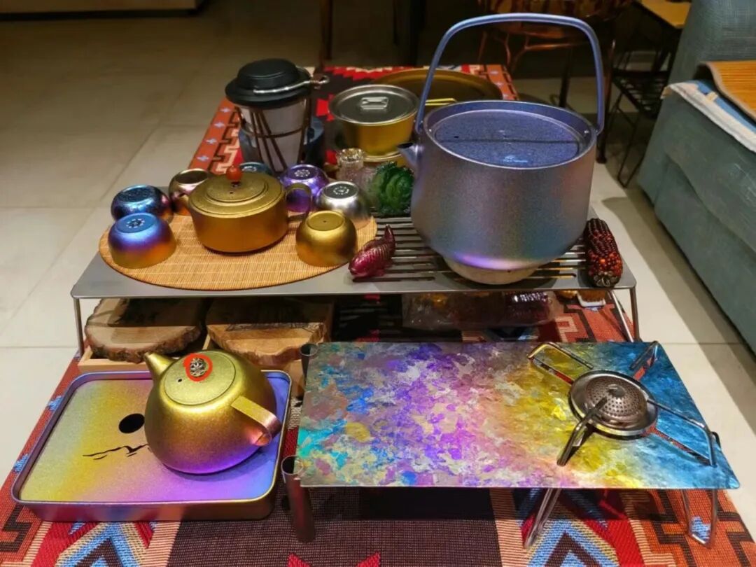 钛制品茶壶、茶碗、水壶以及置物板