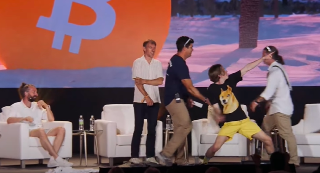 在会议过程中,发生了一个小意外,一名DOGE支持者冲上舞台,脱下外套,露出狗狗头像,并高呼,DOGECOIN TO THE MOON。