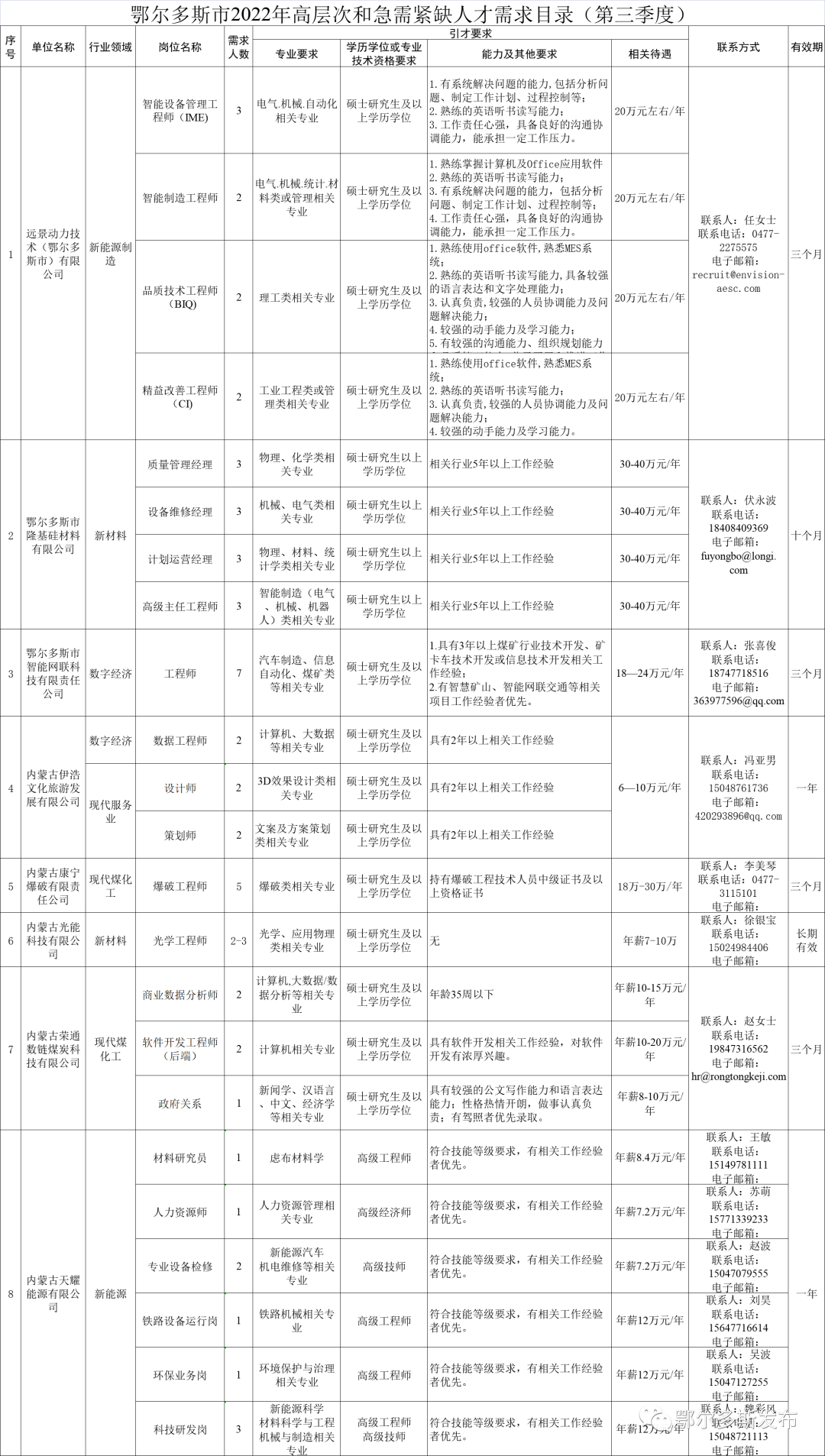 为深入开展招才引智工作,加快实施鄂尔多斯“十百千万”人才计划,精准引进我市重点领域(行业)所需高层次人才和急需紧缺专业人才,根据《鄂尔多斯市关于加强新时代人才工作 助推高质量发展的若干政策》(鄂党发〔2021〕22号)有关精神,鄂尔多斯市人力资源和社会保障局面向全市各类企事业单位征集了2022年第三季度人才需求信息,编制了《鄂尔多斯市2022年人才需求目录(第三季度)》(以下简称《人才需求目录》),现予以公布。