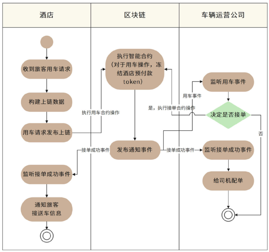 此外,活动图引入了一个重要的概念——泳道。泳道表示一个领域范围,有时候也被称为子域,如上图中三个领域范围:酒店、区块链、车辆运营公司。活动图可以根据活动的范围,将活动根据领域、系统和角色等划分到不同的泳道中,使流程边界更加清晰。