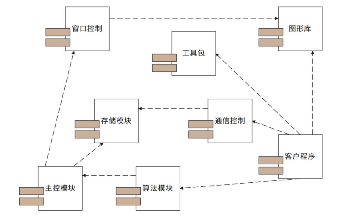 组件是比类粒度更大的设计元素,一个组件中通常包含很多个类。组件图通常用来描述物理上的组件,比如一个 JAR、一个 DLL 等等。在实践中,我们进行模块设计的时候,用得更多的就是组件图。