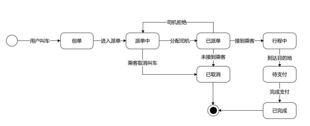 如图所示,在一个网约车系统中,订单状态有创单、派单中、已派单、行程中、已取消、待支付、已完成几种,而每种状态之间变迁的原因可以在图中清楚呈现,状态与变迁关系用一张状态图就可以搞定。