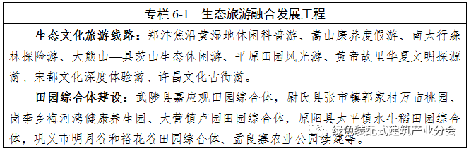 8.“两山两拳”文旅融合示范带建设工程。在郑州登封市和焦作武陟县、温县的部分区域内,通过完善旅游交通基础设施、建立统一标识体系、开展联合宣传推介等,打造以“云台山—陈家沟—少林寺—嵩山”等精品旅游线路为主体的都市圈生态、文化、旅游协同发展先行区。