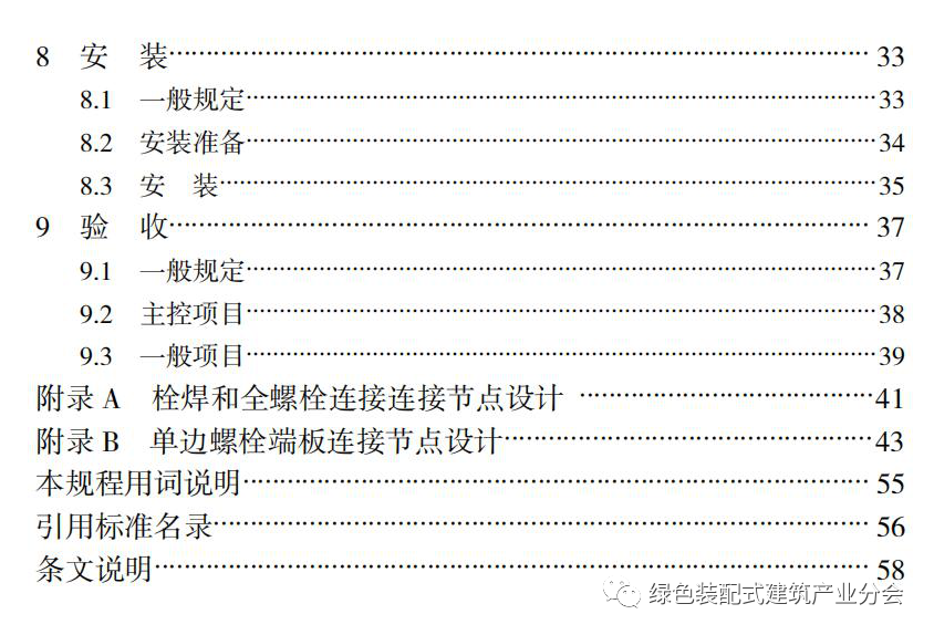 本规程共分 9 章,主要内容有:1.总则;2.术语和符号;3.基 本规定;4.材料;5.结构设计;6.节点与连接;7.生产与运输;8.安 装;9.验收。