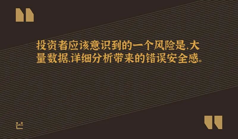 在这个阶段,投资者紧密关注行业数据、增长的驱动因素、运营指标、比较分析等,还有历史年报、季报等详细数据。投资者会把业务的详细数据和情况结合。在这个阶段,投资者可以从数字上知道为什么美国运通(American Express)与好市多(Costco)无法继续合作,如果它不能对标提供维萨卡(Visa)和花旗合作给出好市多的条件的话,或者为什么ESPN对于迪士尼来说是把双刃剑。这个阶段,投资者通常能做出非常细致的公司未来几年量化预测。他能把定性的分析以量化的方式表达出来。笔者非常尊重的价值投资大师Chuck Akre就具备这种能力。投资者应该意识到的一个风险是大量数据、详细分析带来的错误安全感。数字告诉你的是一件事,你的直觉开始告诉你数字是错误的,但是你不知道为什么。