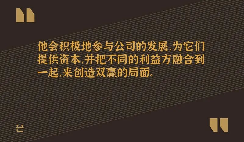 在这个境界,投资者了解一个市场里成功的经验,并把成熟市场的经验运用到不成熟的市场中。这些投资者具备有国际视野,可以对一个行业进行跨时间、跨空间的深度研究和观察。他也会积极地参与公司的发展中,为它们提供资本,并把不同的利益方融合到一起,来创造双赢的局面。